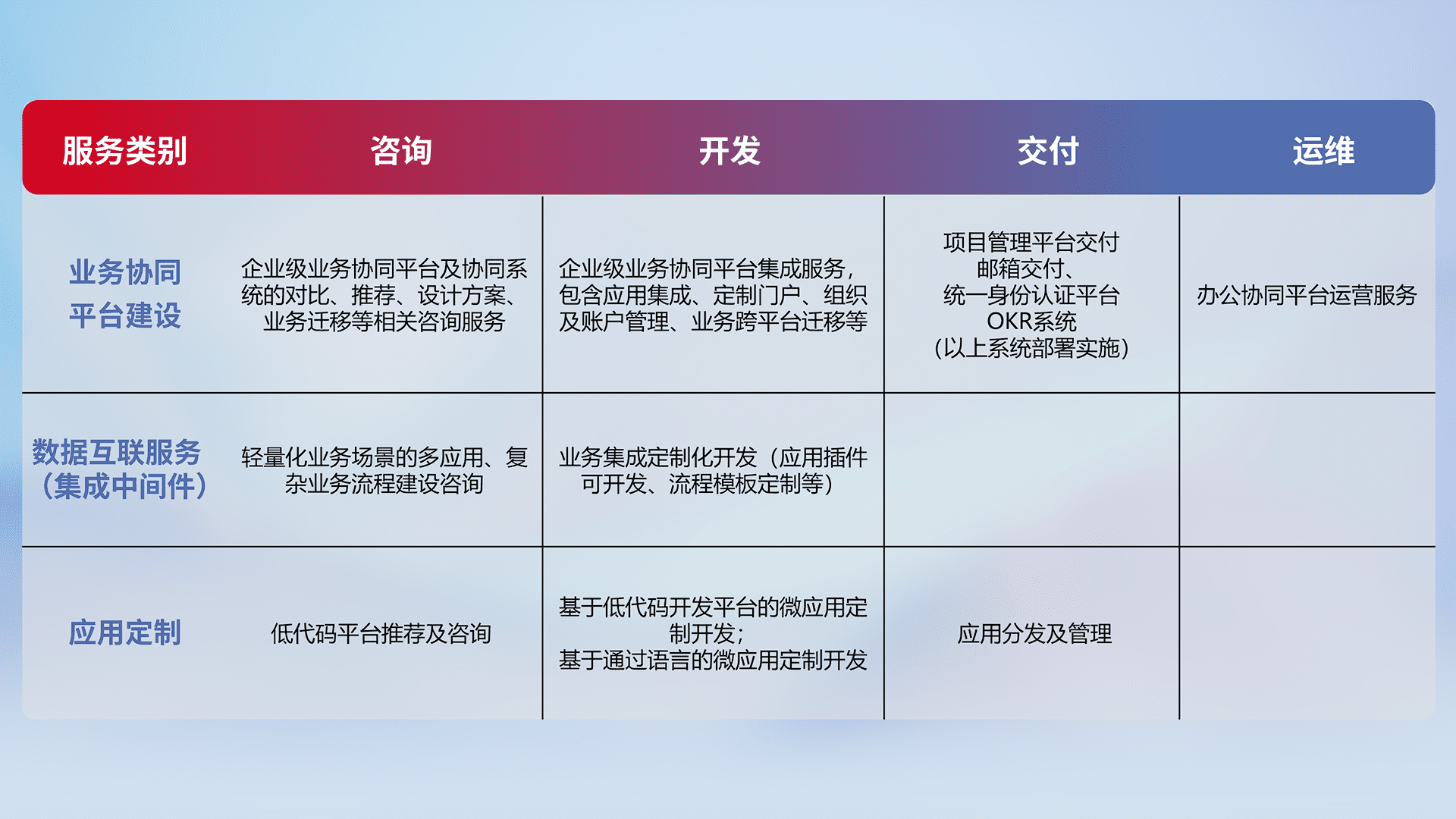 针对钉钉、、、、企微、、、、IDaas等平台级产品提供产品的规划、、方案、、交付、、、定制化开发等服务,,,实现如统一协同办公、、、、智能客户服务、、、、混合会议管理、、、、智能数据查询、、、等业务场景,,,实现数字化转型。。。。