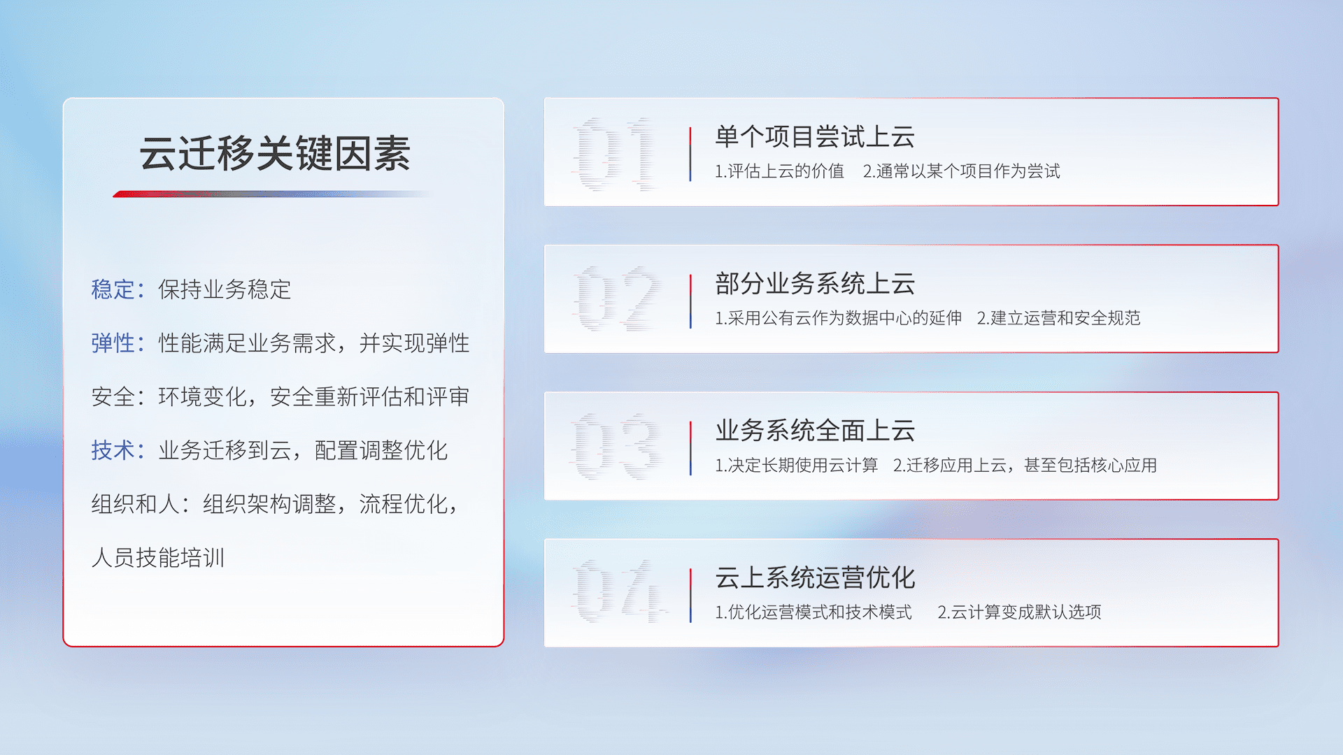 结合实际业务,,,从规划设计、、云平台选型、、云原生改造、、、数据迁移、、集成交付,,,,迁移全过程为客户识别最佳上云路径,,做好风险识别管理,,,设计网络架构、、、、身份权限、、、、安全审计合规、、、操作审计、、日志审计、、、监控告警策略、、、多站点容灾设计等,,对云上基础设施进行整体规划,,提升IT治理水平,,,,以满足弹性、、高可用、、、高性能的需求。。