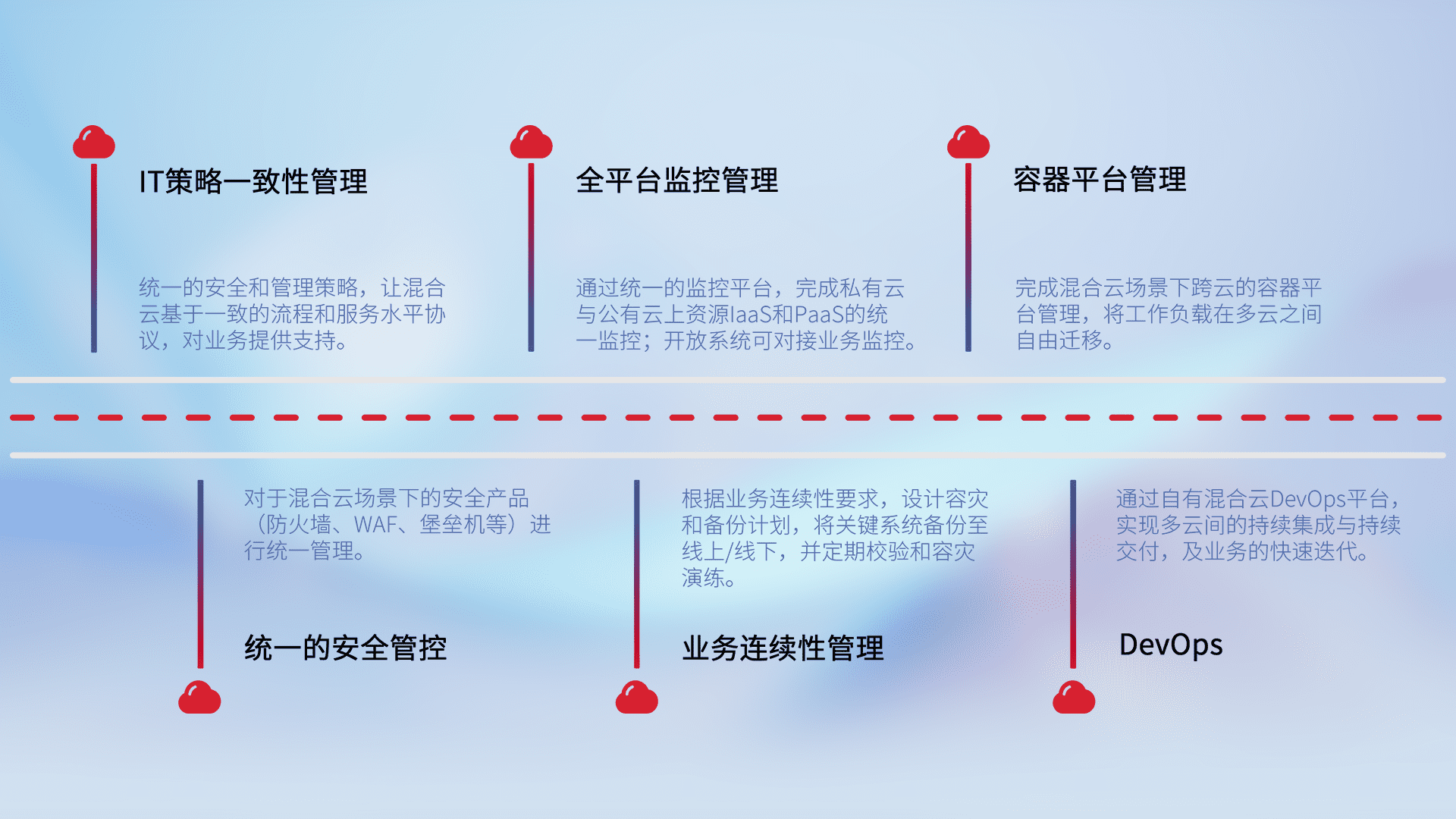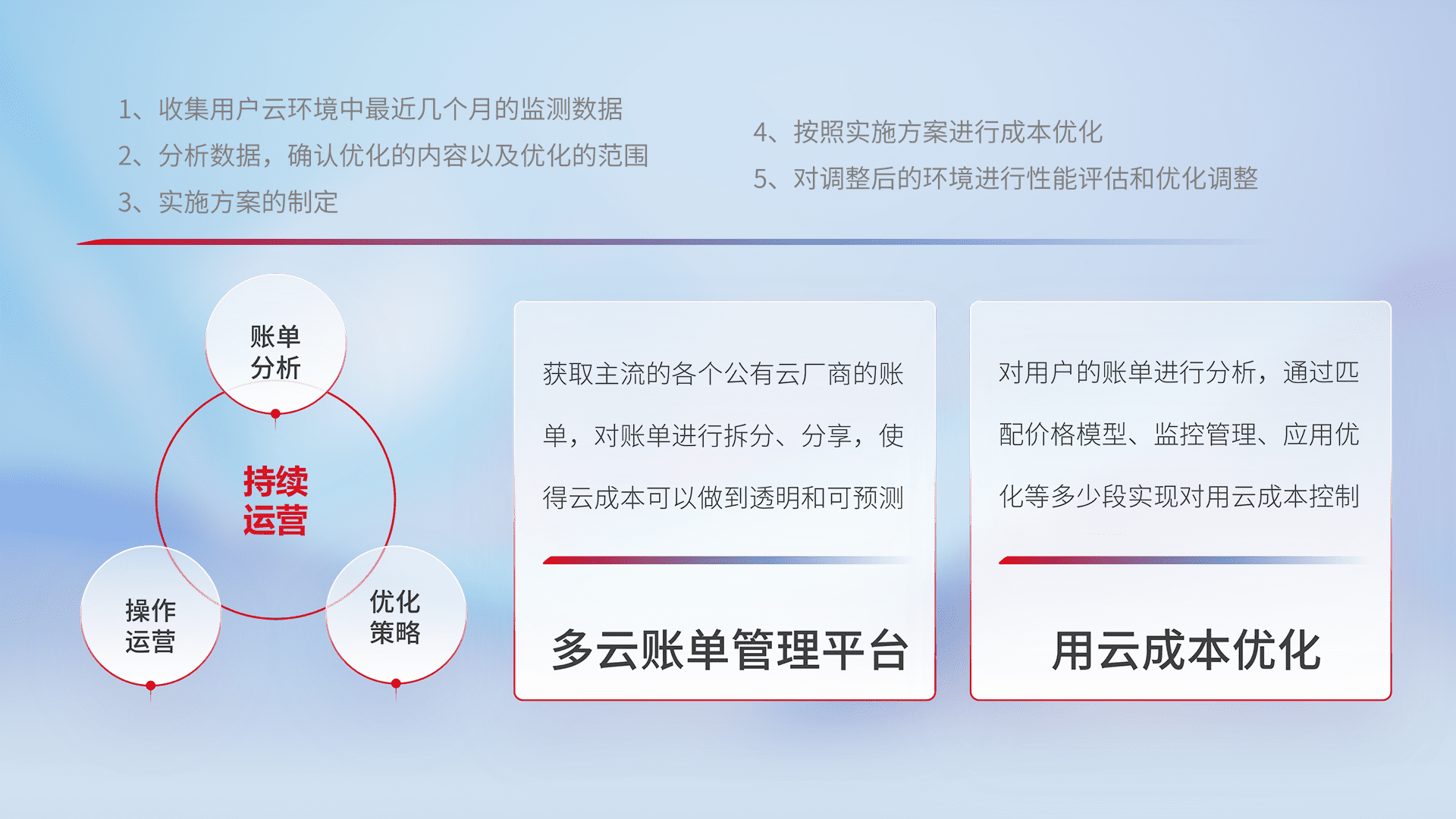 通过多云纳管,,以统一的资源数据模型把客户的云资源进行抽象和封装,,进而实现对多云资源的统一操作,,,保障云资源管理的可靠性、、、、稳定性与可用性。。。。量身定制化运维内容,,,配置、、开发运维、、、补丁管理、、、备份、、、监控、、、、认证和访问管理、、、、审计和日常巡检等,,,,保障在用云过程中的可靠度,,,稳定度以及高可用率。。。
